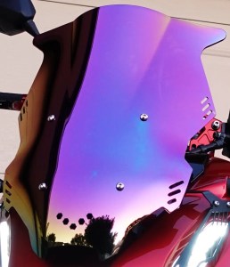 The new windscreen is narrower and taller than the stock screen but does seem to offer better wind protection when the screen is in the up position. Time will tell how well the iridum coating holds up.